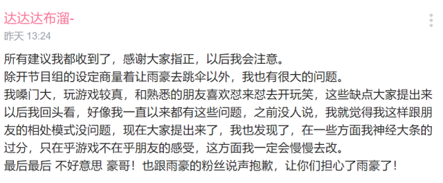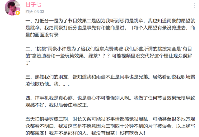 在得知自己的行为引发了不必要的误会之后,他们都进行了道歉以及说明,甘子七解释当时给雨豪打低分,是因为他们都知道雨豪的愿望是跳伞,而惩罚也正是跳伞,是为了满足雨豪的愿望。而且他们私底下的关系都非常好,这样做的就是为了节目效果。