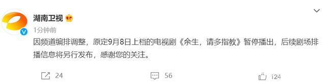 9月5日,湖南卫视发文宣布《余生,请多指教》撤档。官微表示:“因频道编排调整,原定9月8日上档的电视剧《余生,请多指教》暂停播出,后续剧场排播信息将另行发布,感谢您的关注。”