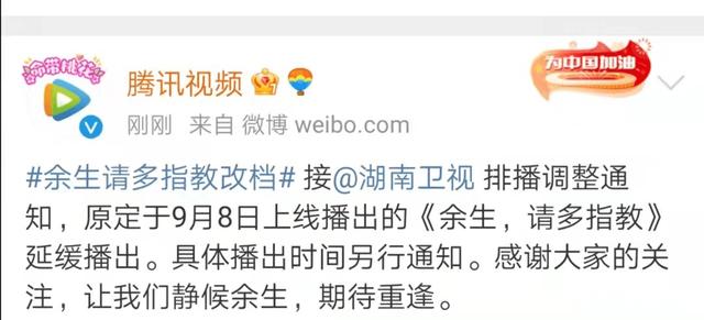 随后,传出网播的爆料也被辟谣。视频网站发声表示接到湖南卫视通知,因排播调整,原定9月8日上线的《余生》,延缓播出,具体播出时间另行通知。看来视频网站也是接到了湖南卫视的通知,只能跟着安排暂缓播出。
