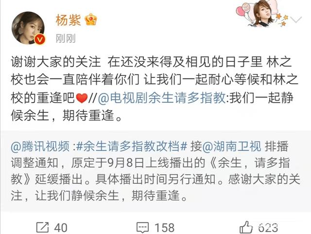 2.《湖南台宣布《余生》撤档,肖战杨紫发文安抚粉丝:感谢大家理解》仅供读者参考,本网站未对该内容进行证实,对其原创性、真实性、完整性、及时性不作任何保证。
