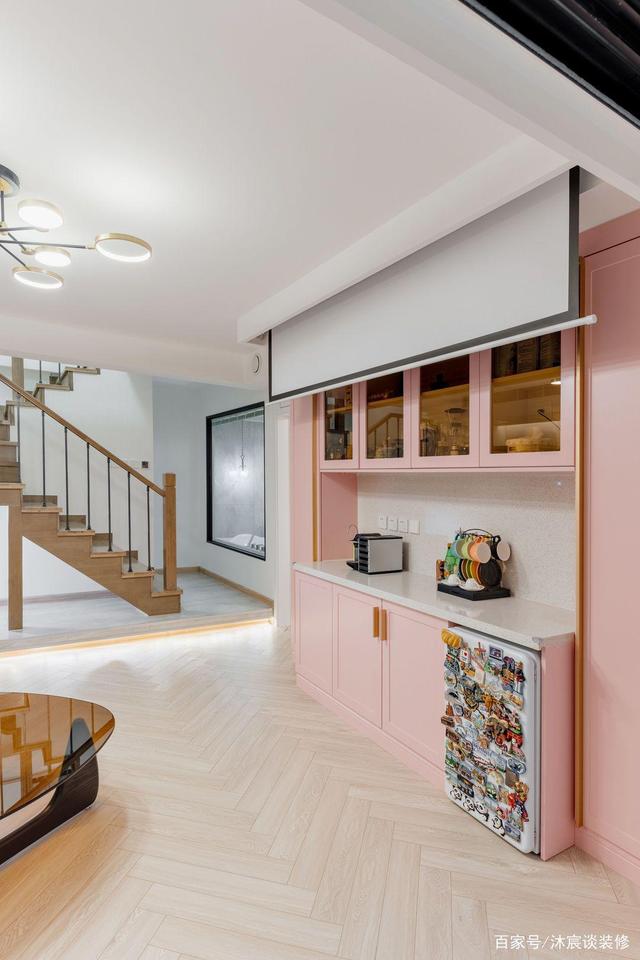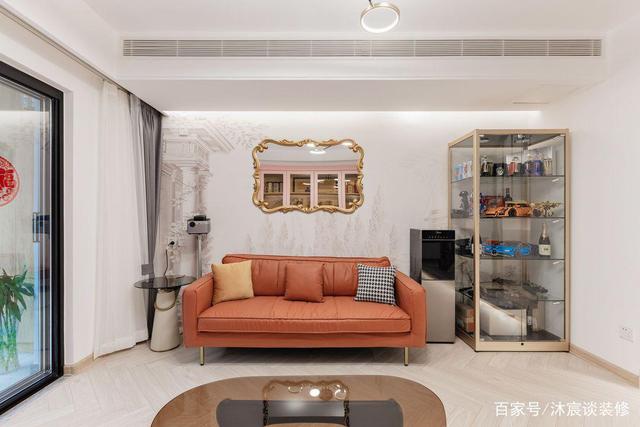 作为两个年轻人的起居室,这里的搭配更加符合他们的年龄,混搭风怎么舒适怎么布置。这里有女主人最喜欢的粉色,让空间浪漫又甜蜜。选择略带复古气质的沙发,也让空间更加有韵味,就连墙面挂的金色镜子,画框看似过于夸张,但放在这里,别有一番味道。