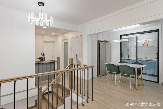 从一层进入就是玄关,这里布置得美观又实用,左边矮鞋柜不档左右两边光线,还能加宽梯扶手带来更多的安全感,右边是定制的高柜,给父母留好换鞋凳,非常方便。因为一家人喜欢现代风,加入金色的点缀,更加显得精致。