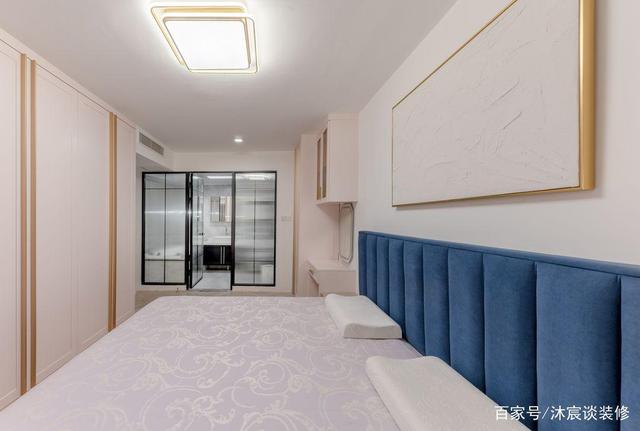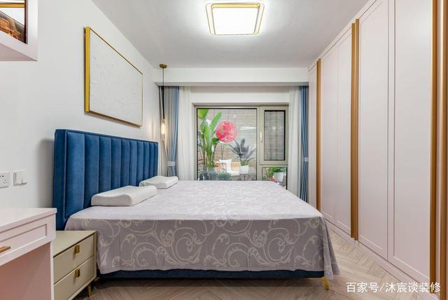 他们两人的休息空间,同样很漂亮,大片的纯色温暖又干净,选择蓝色大床配着室内多处金色,让卧室看着是高级又大方。