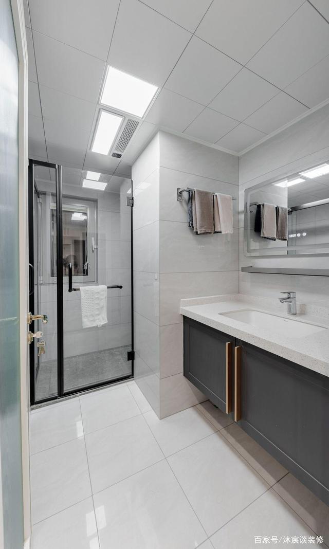 卫生间内部干湿分离设计,很好打理,黑白灰色调里加入金属色点缀,巧妙融合整体空间。