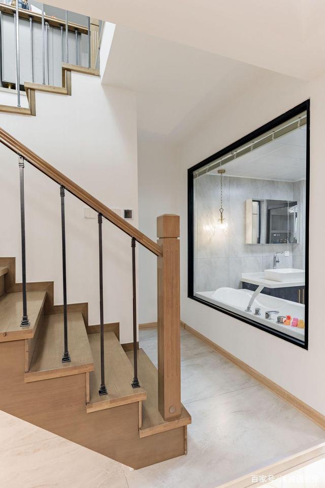 到达负一层,正对着是玻璃卫生间墙,平时不用的时候就是拉开窗帘,提升室内采光。