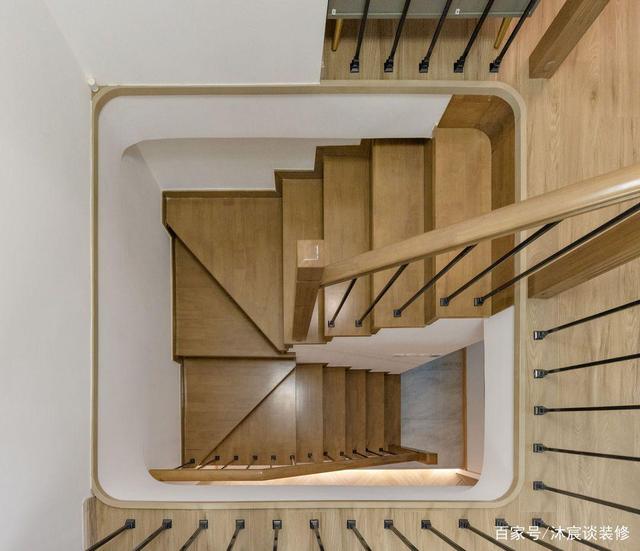 旋转式楼梯通往负一楼,选择木质会更加贴心,会让家里更有温度,而且走起路来比大理石声音更小,小两口夜晚回家是常事,从大门进入立即右转下楼,不会吵到家里人休息。