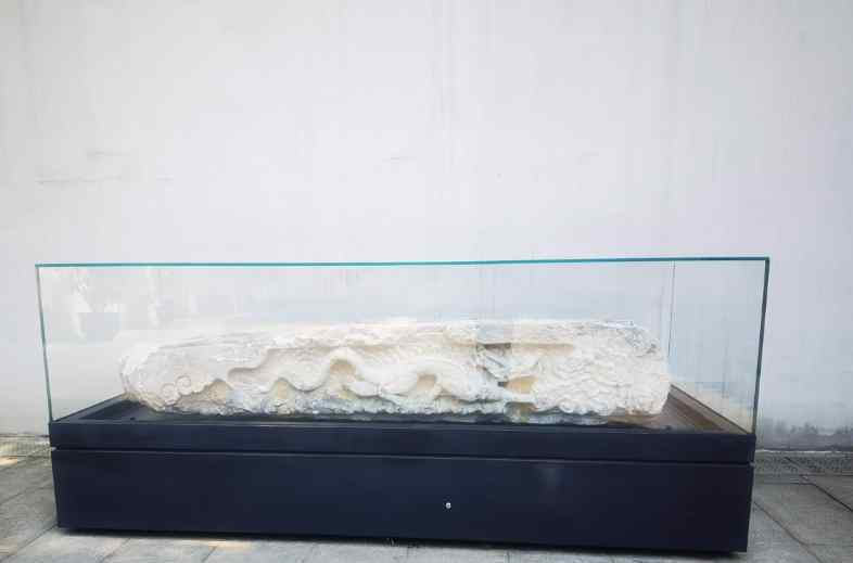 在博物馆院中陈列着一块汉白玉残件,上面雕刻着一条龙。