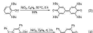 简单的苯酚在过氧化镍的作用下会发生聚合反应,只有空间位阻大的酚类化合物才能在过氧化镍的氧化下实现二聚和齐聚,得到醌类结构化合物,如2,6-二叔丁基苯酚氧化二聚4,4’-二苯醌(式3)。然而,对于具有特殊空间位阻的苯酚底物,可以得到相应的3,5-二取代对亚苯基环戊二烯酮(式4)[3]。