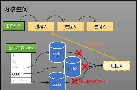 通过这些步骤,当进程A醒来时,它知道至少有一个套接字接收到了数据。程序只需要遍历一次套接字列表就可以得到准备好的套接字。