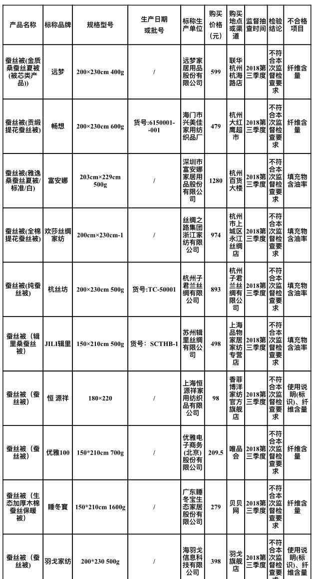 11月2日,浙江省市场监督管理局官网发布了2018年浙江省蚕丝被产品“浙江安全消费”监管抽查结果。