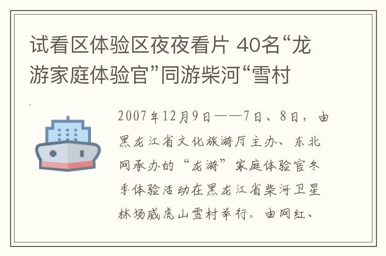 2.《试看区体验区夜夜看片 40名“龙游家庭体验官”同游柴河“雪村” 是什么让他们沉醉其中?》仅供读者参考,本网站未对该内容进行证实,对其原创性、真实性、完整性、及时性不作任何保证。