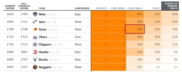 这场比赛过后,太阳的晋级概率已经达到了85%,总决赛概率则是32%——保罗职业生涯至今没有摸过总决赛地板,谁能想到呢,36岁了,居然在太阳拥有了这样的可能性。