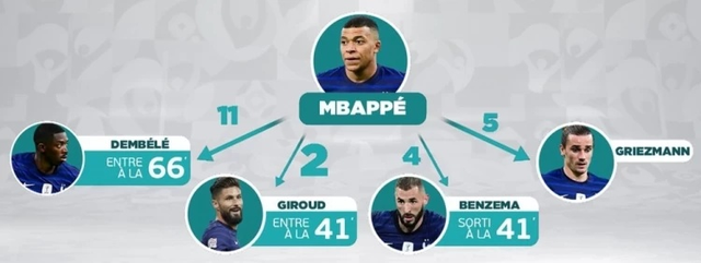 来自《拜因体育》的最新数据统计,他们罗列了姆巴佩在比赛中与队内攻击手之间的传球次数,其中姆巴佩传球给登贝莱的次数是最多的,高达11次,而只有2次传给吉鲁,传给本泽马是4次,传给格列兹曼是5次。