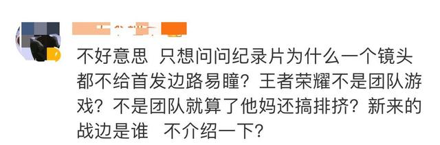 而在比赛结束之后,也往常一样,KPL也是播放了DYG春季赛的纪录片,然而令所有人意外的是,DYG的纪录片,直接被拍成了四个人的小团体,作为边路的易瞳,仅有一个镜头,连说话的权力都没有,也是引起了粉丝们的不满,网友们也对纪录片的制作方表示了严厉的谴责,毕竟王者荣耀是五个人的游戏,而易瞳来到DYG之后,几乎兢兢业业了整个赛季,虽然没有帮助DYG走到更远的地方,但是话说回来,没有功劳也有苦劳,一句话都不配说确实是太过分了。