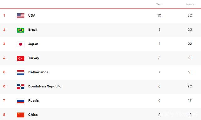 中国队3-0横扫荷兰队,来到了第8的位置,目前,前7分别是美国队、巴西队、日本队、土耳其队、荷兰队、多米尼加队和俄罗斯队。其中,美国队10战全胜,遥遥领先。积分榜上,美国队30分,而中国队只有15分。根据规则,15轮比赛打完后,前四名组成半决赛球队,然后争冠。因此,中国女排接下来的每一场比赛都不容有失,否则距离冠军只会越来越远。