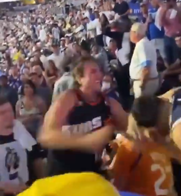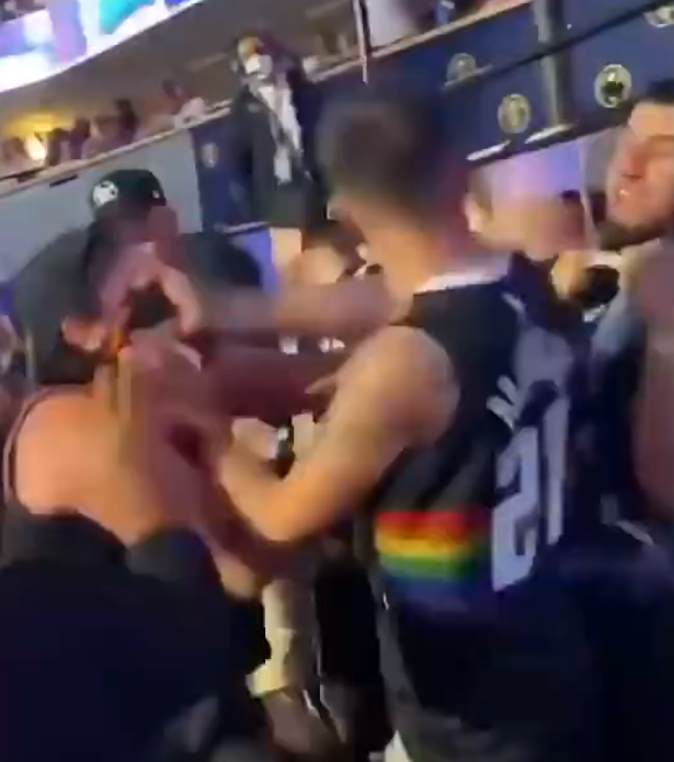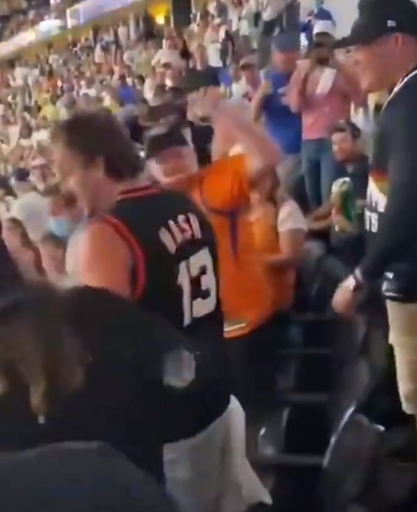 本以为事情就此结束,没想到一名掘金球迷还不服气,趁太阳球迷不注意上去就是一个偷袭,吃了炮拳的太阳球迷很快反应了过来,他揪住这名掘金球迷的衣服,奋力地挥舞着自己沙包大的拳头。这名偷袭的掘金球迷自知理亏,被揪住衣服又没办法乱动,只能用手抱头,防止被疯狂的太阳球迷炮拳爆头。