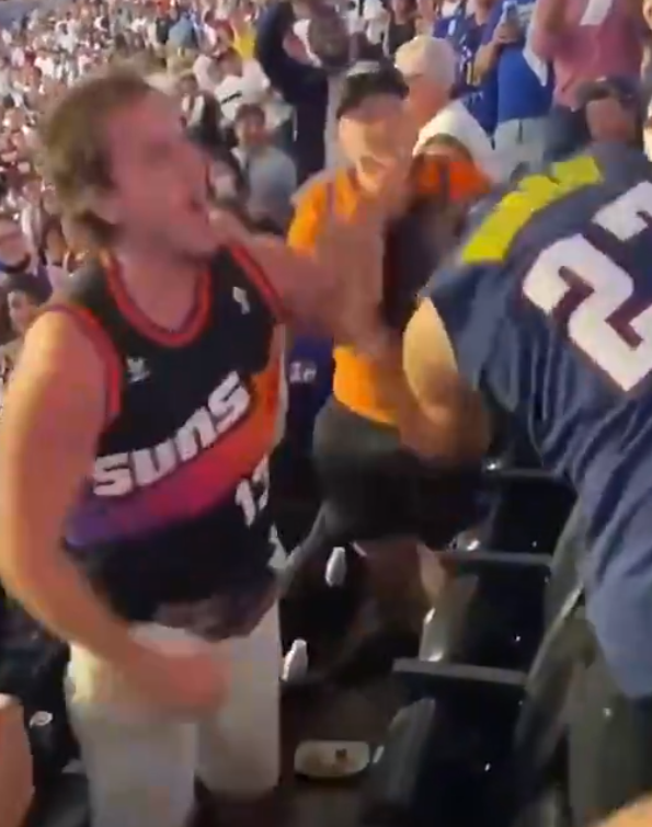 G3比赛在掘金的主场进行,在这场比赛中球场看台上发生了激烈的冲突,一名身穿13号纳什球衣的太阳球迷不知为何与两名身穿27号穆雷球衣的掘金球迷发生了冲突。两名掘金球迷一开始适合这名太阳球迷拉扯,但是太阳球迷激烈反抗,这两名掘金球迷没有占得便宜。旁边的球迷站了出来,拉开了两方避免冲突事态变严重。