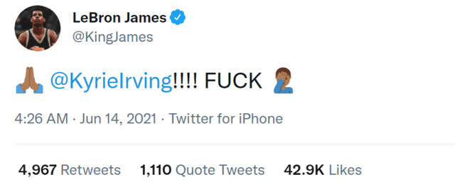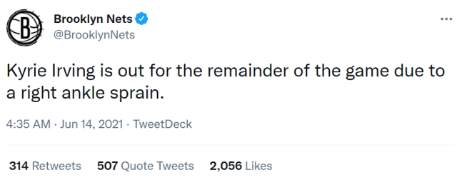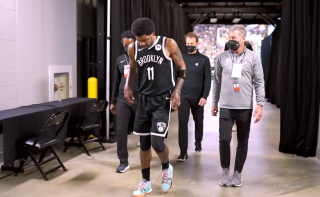 比赛第二节,欧文在一次上篮得分后,落地踩到字母哥的脚面,崴到脚踝。他一瘸一拐地返回更衣室治疗,篮网官方很快宣布,欧文因右脚踝扭伤,将不会在本场比赛回归。欧文前队友詹姆斯第一时间为他祈祷。