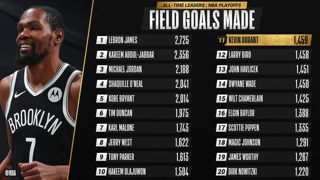 本场比赛,杜兰特季后赛生涯投篮命中数超越拉里-伯德,升至历史第11位。他的下一个追赶目标是奥拉朱旺。