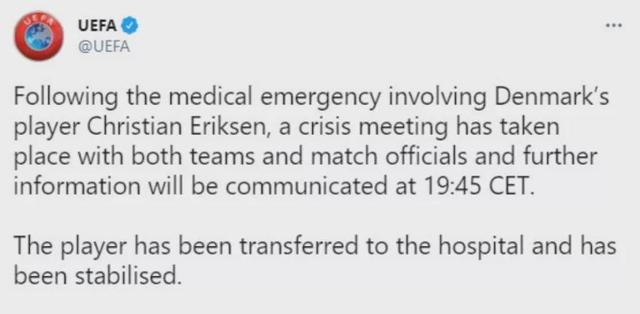 欧足联表示丹麦球员埃里克森已被转移到医院,目前情况稳定。
