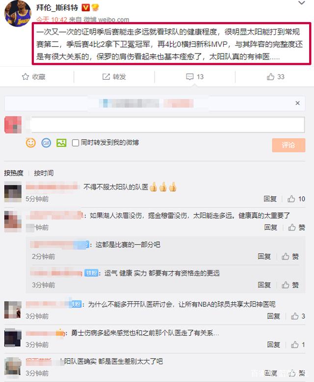 所以说,保罗是MVP,没有任何悬念。但是,也有名博给出了更进一步的看法,“一次又一次的证明季后赛能走多远就看球队的健康程度,很明显太阳能打到常规赛第二,季后赛4比2拿下卫冕冠军,再4比0横扫新科MVP,与其阵容的完整度还是有很大关系的,保罗的肩伤看起来也基本痊愈了,太阳队真的有神医。”个人觉得,这样的说法,很客观。