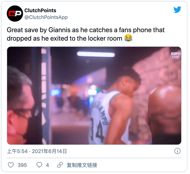 首先是雄鹿当家巨星扬尼斯-阿德托昆博在这场比赛打出亮眼表现后,在他离开球场时有一名球迷的手机正好掉落到字母哥手上: