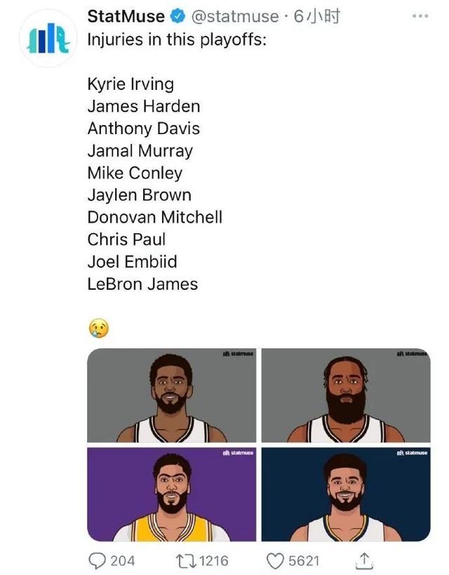 想想也是唏嘘不已,本赛季季后赛遭遇过伤病的球星名单人员实在是太多了。包括:詹姆斯、浓眉、欧文、哈登、穆雷、康利、杰伦-布朗、米切尔、保罗、恩比德等人。