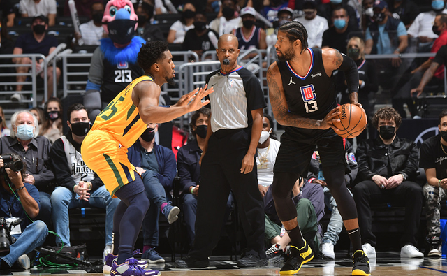 上一场比赛,米切尔在末节比赛中受伤离场,不过经检查并无大碍,他本来可以回归赛场继续战斗,但当时分差已经过大,爵士队为保险起见提前放弃了比赛。本场G4,双方的首发阵容,爵士队这边派出的是米切尔+戈贝尔+博格丹诺维奇+奥尼尔+英格尔斯。快船队派出的是伦纳德+乔治+巴图姆+雷吉杰克逊+小莫里斯。