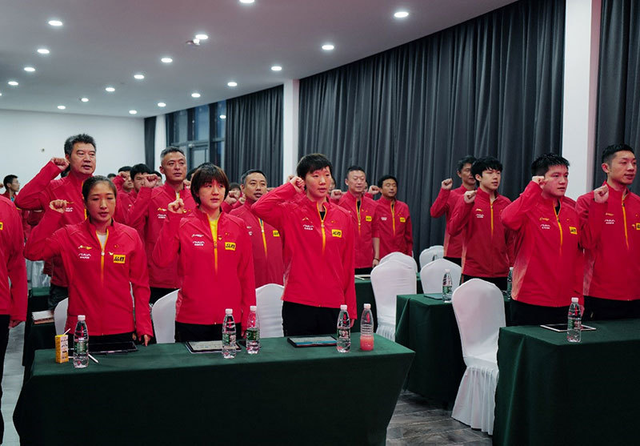 国乒五月底抵达威海南海乒乓球训练基地进行封闭集训,为东京奥运会做最后的准备。近日,国乒组织召开了东京奥运会反兴奋剂工作会议,参会人员身穿统一的红色队服,在宣誓环节,即将迎来自己首次奥运之旅的20岁小将孙颖莎率领大家进行宣誓。只见孙颖莎站在会议室前方,左手拿着宣誓誓词,右手紧握拳头举起放在耳边,表情严肃地宣读誓词。