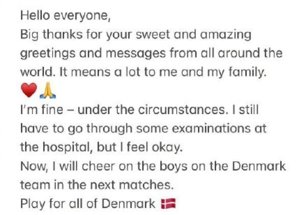 “我现在情况得到了控制,但还需要在医院进行一些检查,但是我感觉好多了。”“现在,我将为我丹麦队的伙伴们加油,希望大家拼尽全力为丹麦。”