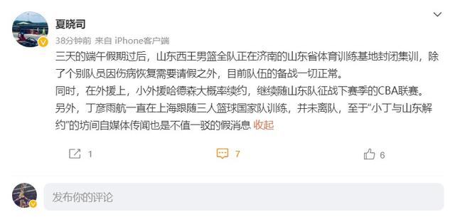 至于球迷关注的丁彦雨航,夏晓司表示丁彦雨航并没有离队。近日有一些自媒体发文表示,丁彦雨航已经和山东队分道扬镳,对此夏晓司表示:丁彦雨航一直在上海跟随三人篮球国家队训练,并未离队,至于“小丁与山东解约”的坊间自媒体传闻也是不值一驳的假消息。