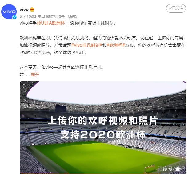 而在今年 6 月 7 日,vivo 官博发布消息,邀请全世界球迷参与 “ vivo 非凡时刻 ” 欢呼征集,球迷们可以在网络上传自己的欢呼、助威和掌声的视频以及图片,然后由 vivo将这些精彩时刻带到欧洲杯赛场。