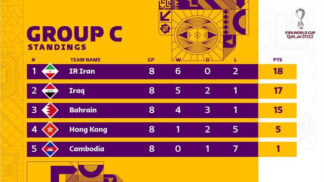 C组的最终积分情况,伊朗拿到18分获得小组第一,伊拉克以1分之差屈居第2,巴林、中国香港和柬埔寨分列3-5位。