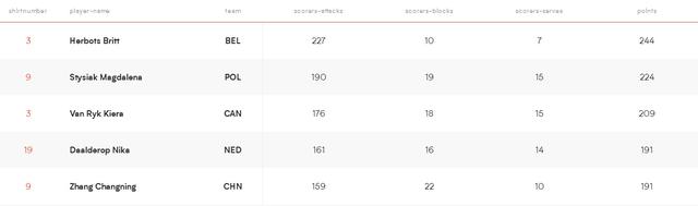 值得一提的是,在朱婷缺阵的情况下,张常宁扛起了女排得分的大旗,截止到目前她的总得分数进入本届世界女排联赛的前五,与荷兰队名将尼卡均得到191分。此外,张常宁的拦网可谓冠绝全场,目前她的拦网得分已达到22分,比本届联赛的第一得分手、比利时主攻不里特·赫博茨多出12分,拦网方面张常宁仅次于土耳其队长兼助攻艾德姆。