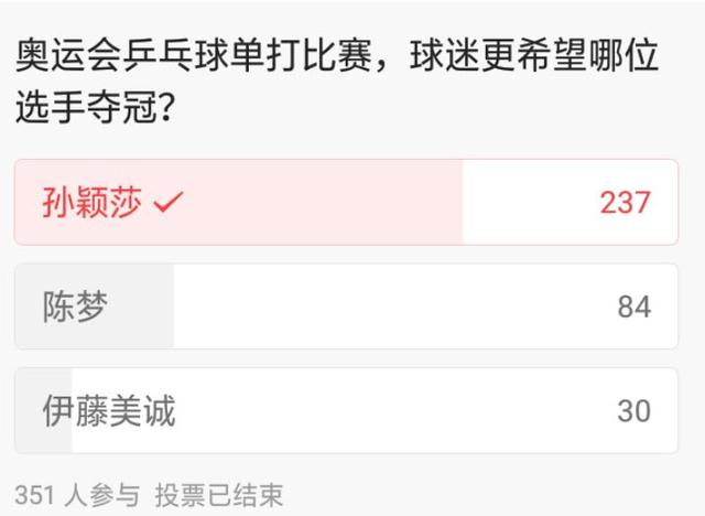 刚刚做完一个调查,那就是让球迷粉丝投票选举希望哪位乒乓球的选手,奥运会单打夺冠?在孙颖莎、陈梦还有伊藤美诚三个候选人当中,孙颖莎得票是最高的,遥遥领先,陈梦紧随其后,得票最低的是伊藤美诚。相信这样的投票结果也代表了广大球迷的心声,孙颖莎的得票率差不多是陈梦的3倍,是伊藤美诚的7倍多。为什么这么多人力挺孙颖莎夺冠呢?其实这是大势所趋,任何人为的干预都无法改变这样的投票结果,这确实有一定的普遍性,代表了广大球迷的意见。