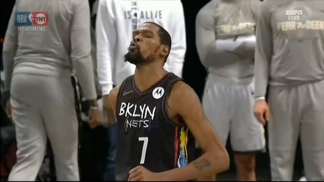 哈登在一分钟内掌控球权,但在弧顶停球浪费了太多时间,最后杜兰特赶来接到接锅球,但是急停高难度三分无解命中,帮助球队将领先扩大到4分。命中之后杜兰特还送上了飞吻。