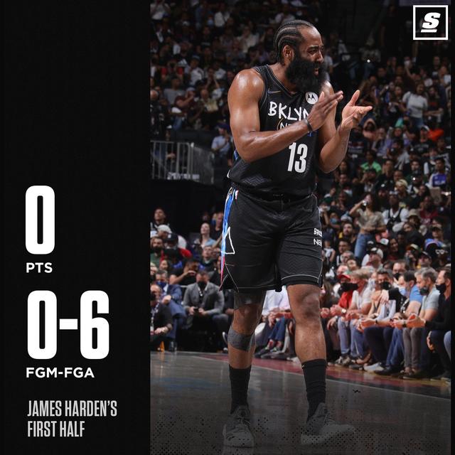 然而腿筋伤势始终困扰着哈登,他的移动明显缓慢了很多,无法靠单打得分,投篮手感同样受到影响。虽然他依然坚持出战,整个上半场只休息了2分钟,但6次出手无一命中,其中三分球5中0,正负值为-16,篮网也落后了对手16分之多。