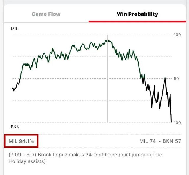 一个数据是,在第三节过半时,媒体给出的雄鹿赢球概率达到了94.1%,换言之篮网只有5.9%的概率翻盘,但是有杜兰特,这5.9%的奇迹发生了。