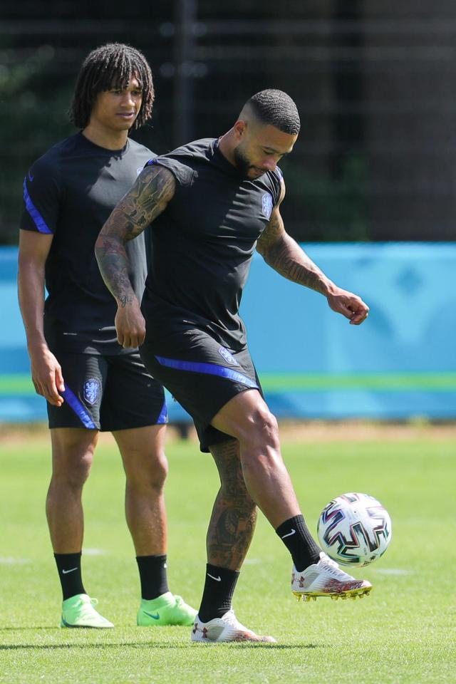 6月16日,荷兰队球员德佩(右)与队友阿克一同训练。新华社记者 郑焕松 摄