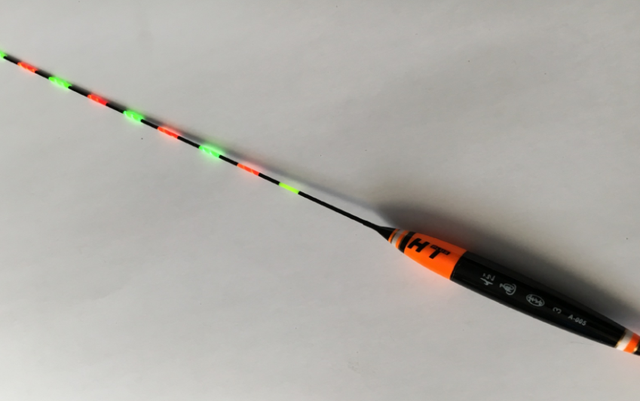一是我们常见的普通漂尾。这种漂尾的特点就是亮,在夜晚亮度很高,非常明显,用七八米的长竿也能清除的看到浮漂。但是其缺点也是太亮,如果我们长时间盯着,就会出现眼花的情况,时间长了反而看不清浮漂的动作;看的时间长了眼睛会不舒服,对眼睛有损伤;另外就是在水中的倒影很明显,钓一会,可能就分不清这是几目了。所以不建议大家选择这种浮漂。