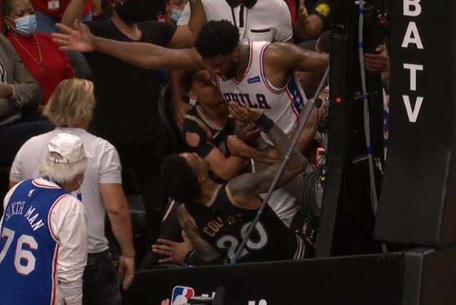 费城与老鹰G6生死战在老鹰主场巨星,本场比赛,费城如果输球就要告别本赛季回去钓鱼了,而老鹰队借着过去两场大逆转的气势,开场后攻势如虹,在特雷杨的带领下,他们打了一波20-8的同时取得两位数领先,不过随后小库里发威帮助球队逐渐追上比分,双方进入拉锯战,费城则在第四节开始逐渐掌握领先优势,而在该节还剩4分钟时,场上发生意外一幕,恩比德和科林斯互推爆发冲突。