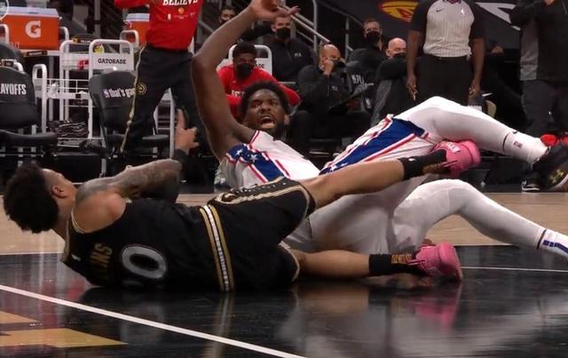 从慢动作回放可以看到,恩比德上篮时因为肘部撞到了科林斯下巴,后者可能认为恩比德是故意的,而倒地后又刚好被恩比德压在身下,这让他非常不满,他愤怒起身并推了恩比德一下,而恩比德马上也起身冲向他,但恩比德起身与科林斯搂在一起的时候,他突然意识到应该保持冷静,所以双手摊开,向裁判示意自己并没有多余动作,而此时双方队员也围了过来,科林斯因为身体失去平衡,整个人倒在了篮球架后面,不过恩比德一直摊开双手,才避免了冲突进一步加剧。