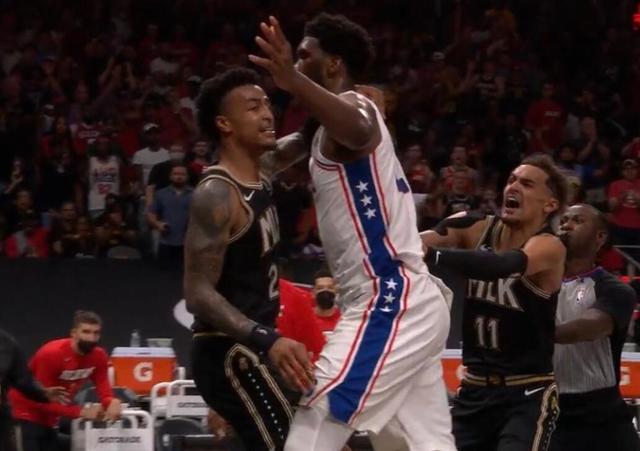 随后裁判吹停比赛,他们通过视频回放,最终吹了恩比德和科林斯一人一个技术犯规,比赛继续进行。
