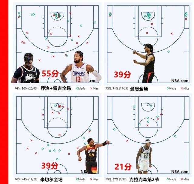爵士快船的G6有一对鲜明的得分对比:第二节克拉克森独取21分,第三节曼恩独取20分。如果说正确的打法是根,合适的阵容是树干,那么克拉克森是爵士队上半场绽开的花朵,曼恩是快船第一、三节绽放的花朵。