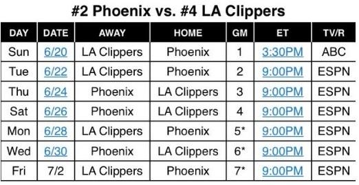 快船与太阳的系列赛将于北京时间6月21日在后者主场开打,具体安排见上图(图中时间为美国时间)。