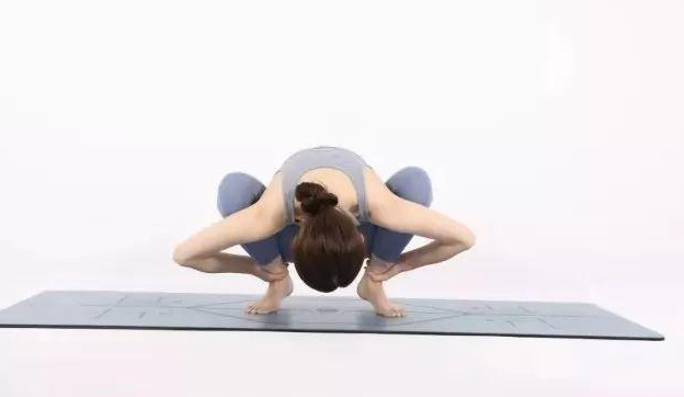 ③把我们的双手向外打开,绕过膝盖下端,让我们的膝盖向两头打开,然后双手向外抓住脚踝。