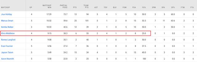 这轮系列赛开始前,没有人想到限制米德尔顿最好的球员居然是欧文。欧文这轮系列赛和米德尔顿直接对位时间为9分钟。这9分钟内米德尔顿出手8次投丢6球,一共得到6分。而且出现多达4次失误。 (下图)