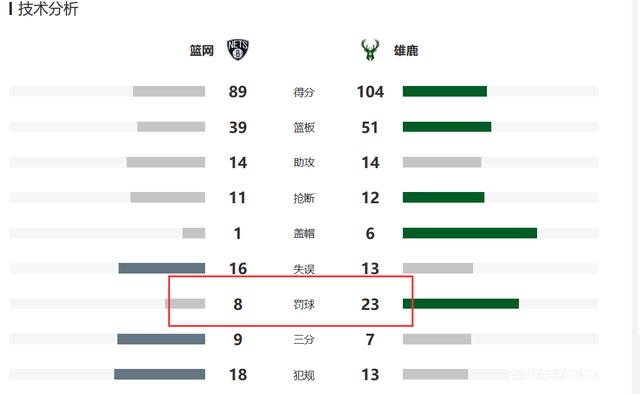 第6场比赛,篮网一共获得14个罚球机会,只命中其中的8个。雄鹿全场一共获得28个罚球机会,是对手的两倍。罚球这一项雄鹿就遥遥领先,内线冲击造杀伤永远是雄鹿的最大优势。