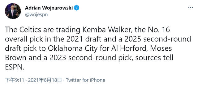 交易细节为:绿军送出沃克+今年第16顺位选秀权+2025年的次轮签,从雷霆换来旧将霍福德+摩西-布朗和2023年次轮。