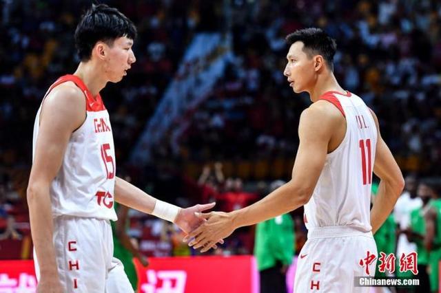 资料图:易建联(右)与周琦击掌。当晚,2019年国际篮联篮球世界杯17-32名排位赛继续进行,在广州举行的M组一场比赛中,中国73比86不敌尼日利亚。中新社记者 陈骥旻 摄